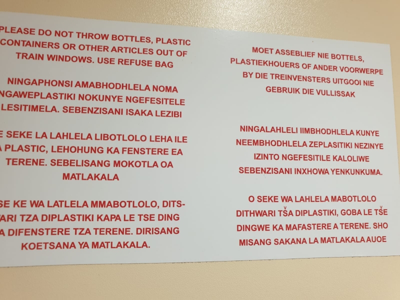 Südafrikaner sagen uns: Euer bunter Zug ist sicher, aber vergesst, was Ihr aus Deutschland über Pünktlichkeit wisst...wir sagen, damit sei es bei der Deutschen Bahn auch nicht mehr so weit her...sie lächeln milde..hakuna matata.