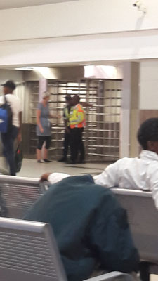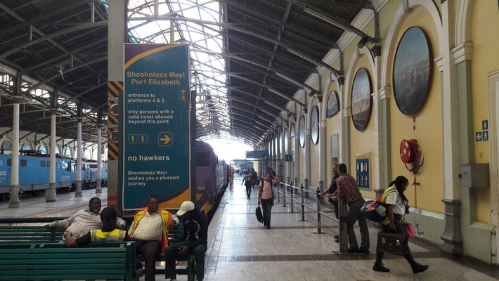 Größter Bahnhof Afrikas: Johannesburg. Isa fragt nach dem richtigen Gleis und wird sofort von drei Sicherheitsleuten betreut. Das mit der Sicherheit stimmt schon mal...