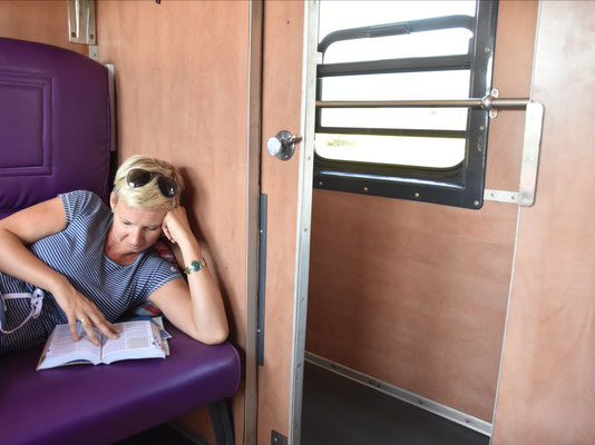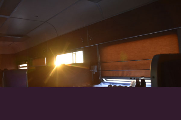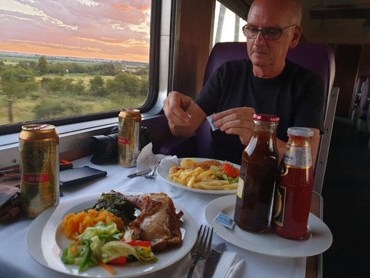Als wir nach fünf(!) Stunden gerade mal 100 Kilometer geschafft haben, genehmigen wir uns auf diesen Erfolg ein Bier... Die "Fahrt" ist unglaublich: Wir haben ein großes Abteil für uns alleine, bekommen Abendessen aus einer richtigen Küche von einem richtigen Koch und genießen tolle Aussichten: