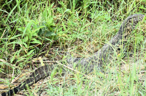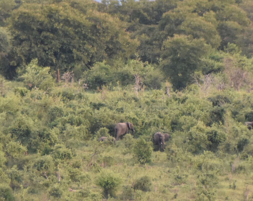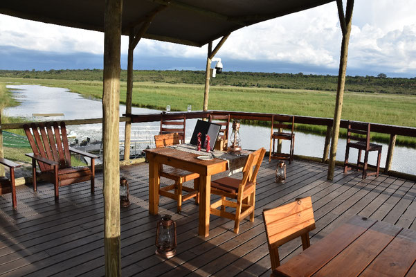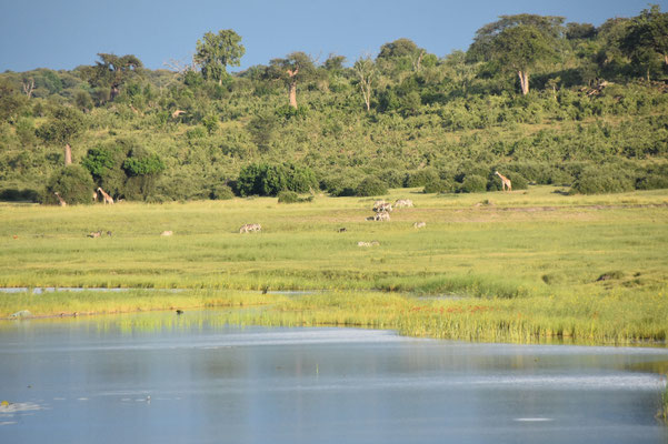 Zum Abendessen (wir sind mal wieder die einzigen Gäste) sehen wir über den Chobe nach Botsuana: Elefanten und Giraffen kommen zum Fluss: