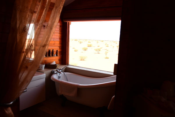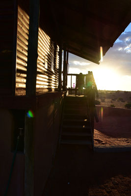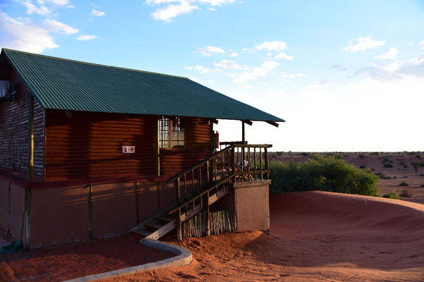 Wir sind in der Kalahari! Ein Traum wird wahr. Um uns herum rote Dünen wohin das Auge reicht. In der Bagatelle Ranch empfängt uns eine nette Dame. Wir sollen dem Weg weiter folgen. Unsere Hütte sei auf der zweiten Düne hinten links! Ok - wir sehen zwar vor lauter Sand die Wüste kaum, aber wir werden "unsere" Düne schon finden. Herr Hakuna Matata muss mit Unterstützung afrikanischer Bauarbeiter seine Allradkünste im Sand nun so richtig unter Beweis stellen. Wir finden schließlich eine Holzhüte mit Wellblechdach - und der Schlüssel passt!