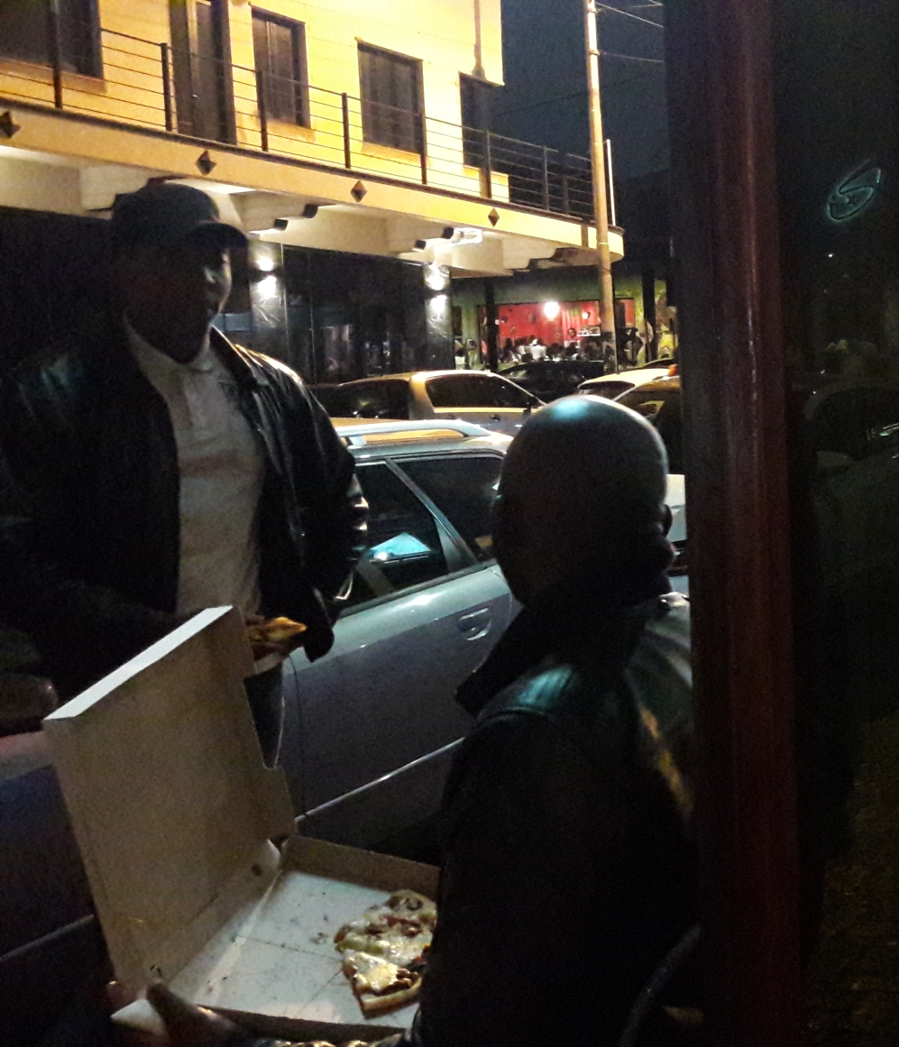 Vor unserem Fenster wird Pizza geteilt: