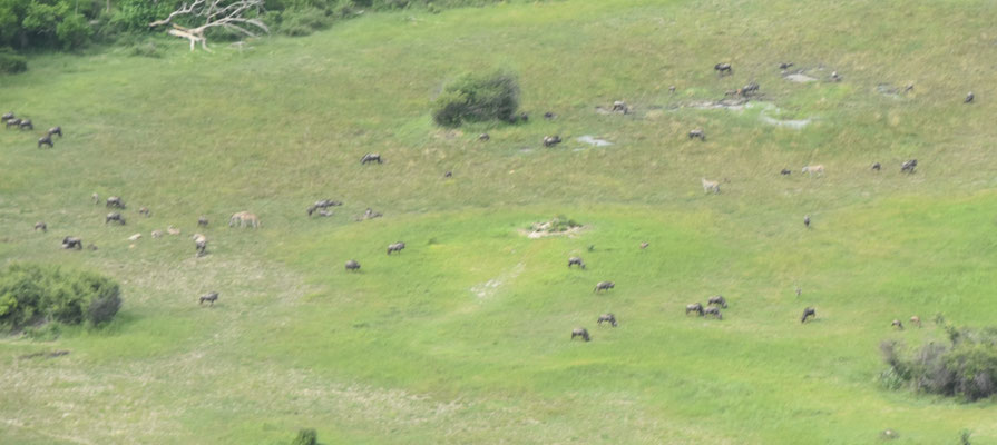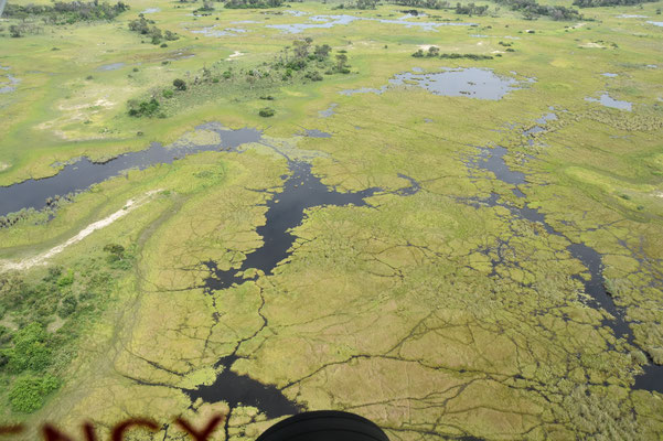 Grzimeks legendäre Luftaufnahmen aus den Anfängen der Safaris in den 60ern haben uns schon lange fasziniert. Ein wenig sind wir ihm heute gefolgt - nur eben überm Okavangodelta statt über der Serengeti. Der Okavango fließt nicht ins Meer, sondern versickert einfach in einem Sandbecken. Die Landschaft ist unglaublich schön!