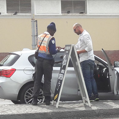 Wir haben "menschliche Parkuhren" getroffen, das sind einfach Menschen, die keine Knöllchen verteilen, sondern mit Parkenden direkt die Parkgebühren aushandeln: