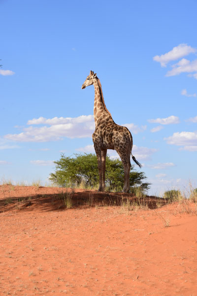 Wir sind in der Kalahari! Ein Traum wird wahr. Um uns herum rote Dünen wohin das Auge reicht. In der Bagatelle Ranch empfängt uns eine nette Dame. Wir sollen dem Weg weiter folgen. Unsere Hütte sei auf der zweiten Düne hinten links! Ok - wir sehen zwar vor lauter Sand die Wüste kaum, aber wir werden "unsere" Düne schon finden.