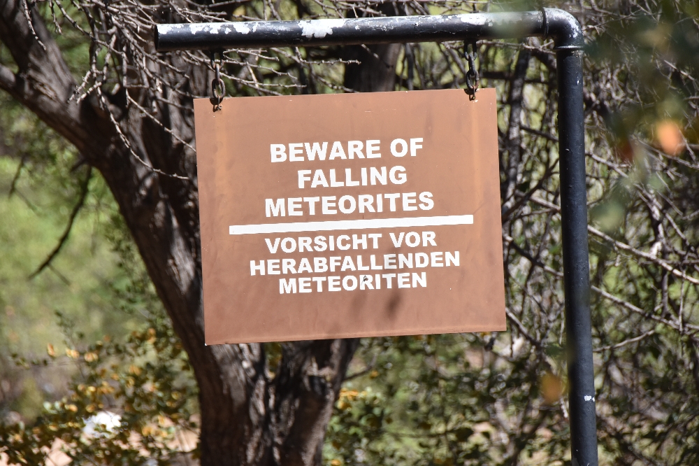 Dieses Schild warnt uns augenzwinkernd davor, dass hier alles etwas anders ist. Zum Beispiel kam dieser Besucher aus dem All vor 80000 Jahren nach Grootfontein in Nordostnamibia.