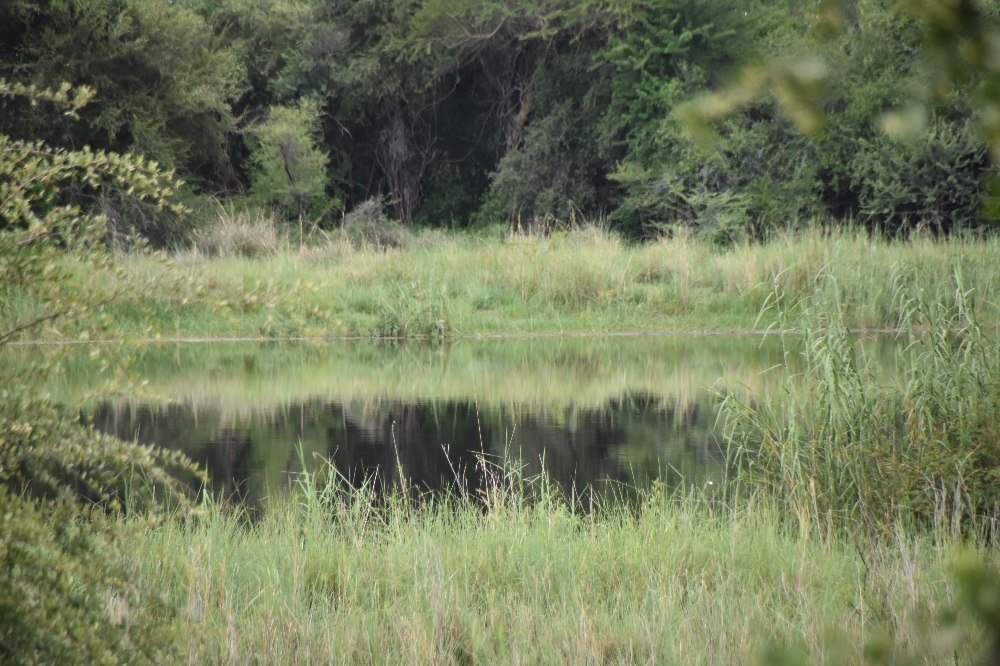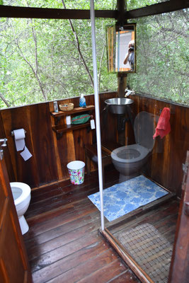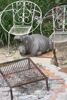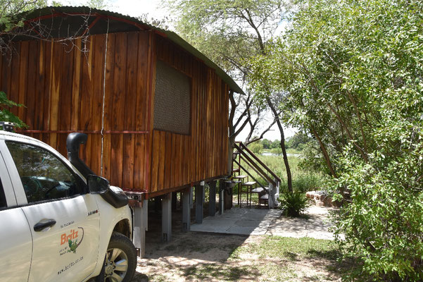 Normalerweise ist hier Flusspferddurchgangsverkehr. Da es in Angola jedoch zu wenig geregnet hat, fällt die Rushhour aus. Die Hippos warten dann wohl weiter östlich auf uns. Das einzige Flusspferd weit und breit bewacht unsere Holzhütte.