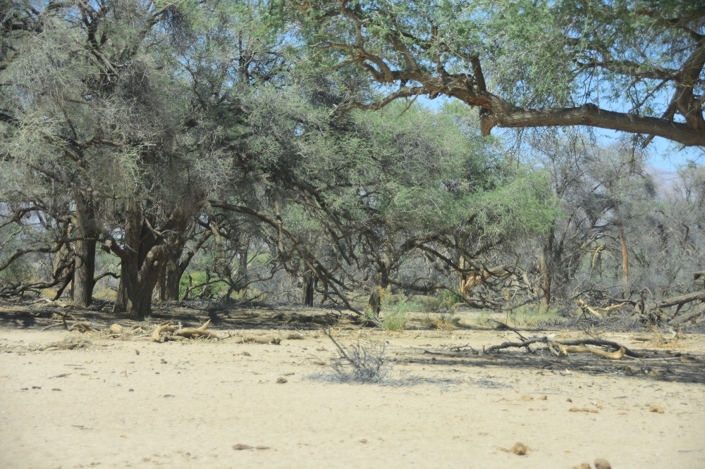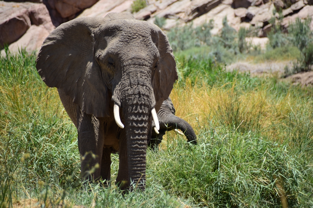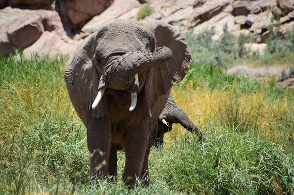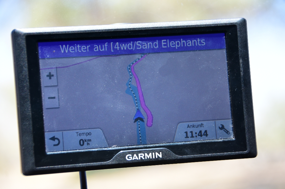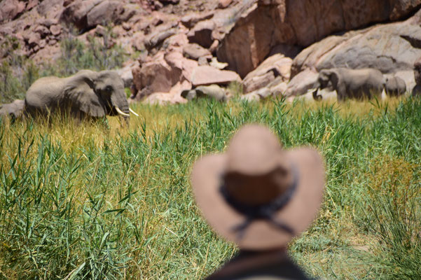 Eigentlich haben uns Wanderungen zu den uralten Felsmalereien her gelockt. Aber die "White Lady" (die wohl berühmteste Felsmalerei) muss noch warten. Unser Gastgeber Mike hat uns nämlich auf der Karte gezeigt, wo wir heute wohl Wüstenelefanten antreffen können! Sie sind vermutlich im augetrockneten Flussbett des Ugab, um die letzten Wasserpfützen zu nutzen. Ein Blick auf unser Auto "Herr Hakuna Matata" lässt ihn zuversichtlich wirken, dass wir die Offroad-Strecke schaffen. Das Flussbett hat es in sich.