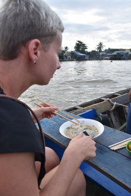 Der kulinarische Teil des Tages beginnt mit traditionellem Frühstück: "Pho" - Nudelsuppe mit Fleisch - und einem Eiskaffee.