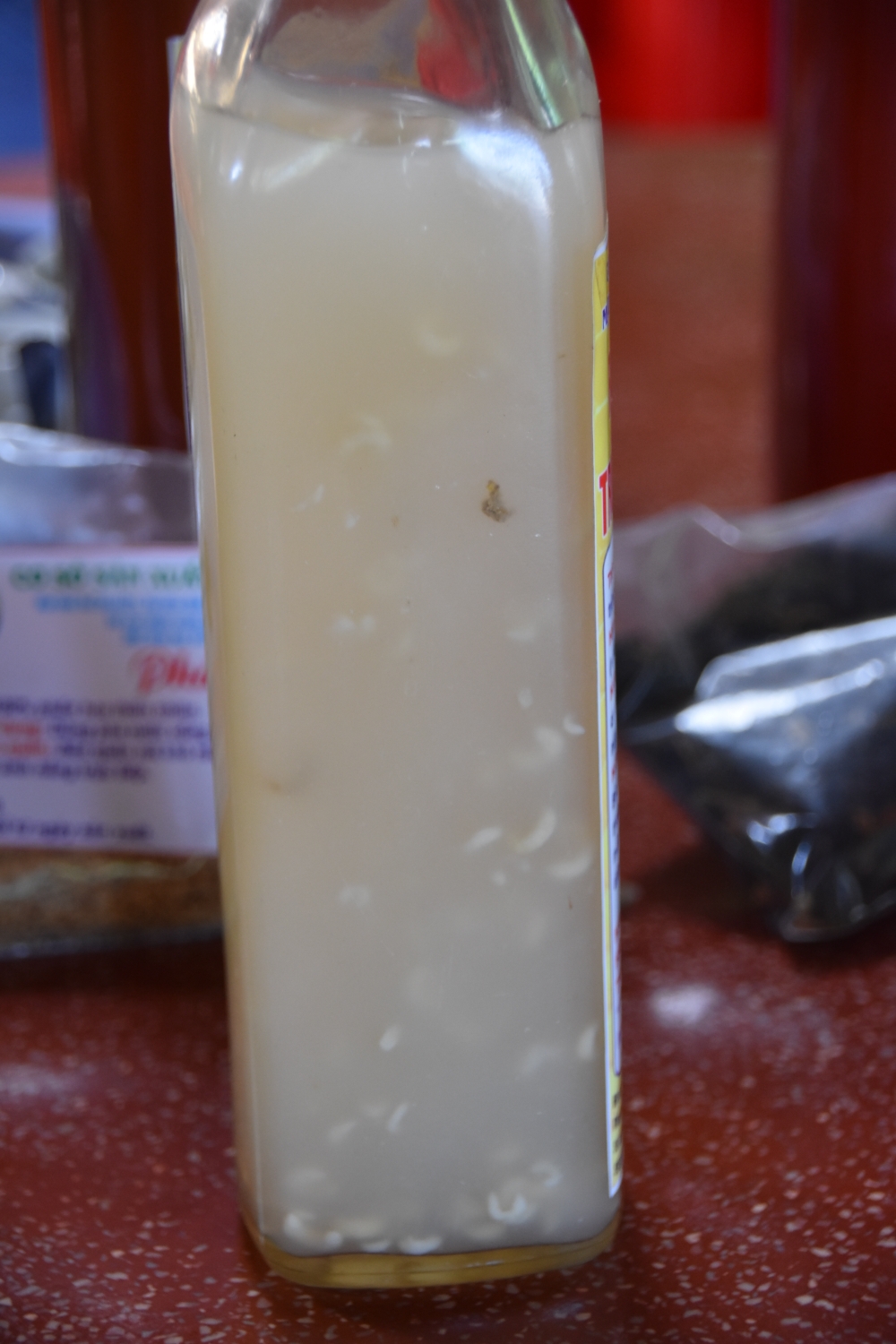 Hier kosten wir auch unseren ersten Reiswein. Wir entscheiden uns gegen den mit Schlange und für den mit Würmen.