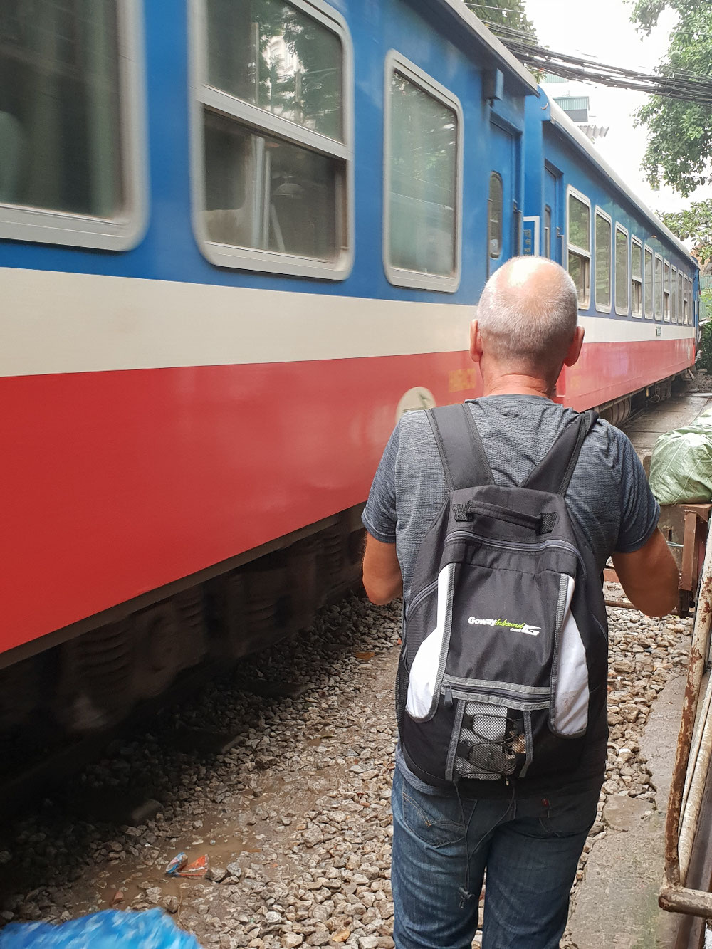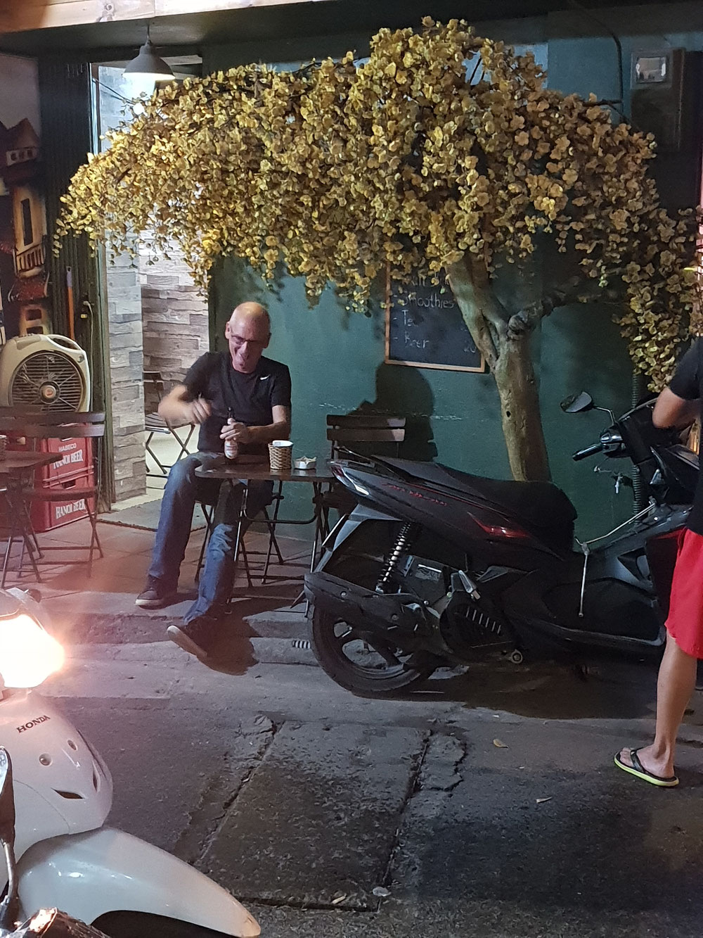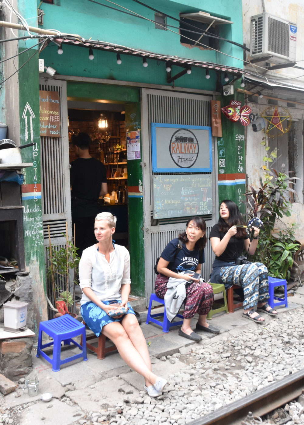 Und dann gibt es noch einen Zug, der mitten durch die Altstadt fährt. Kurz bevor der Zug kommt, ist hier auf den Gleisen ein Café, das statt Getränkepreisen vorsorglich schon einmal den Zugfahrplan auf die Werbetafel schreibt, um die Gäste auf die Unterbrechung vorzubereiten.
