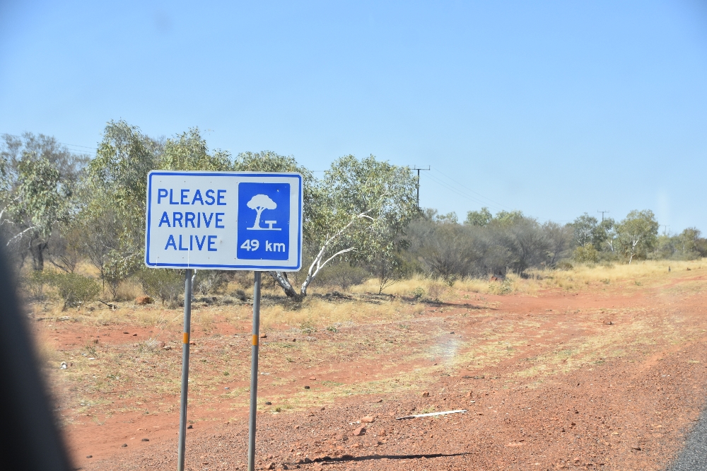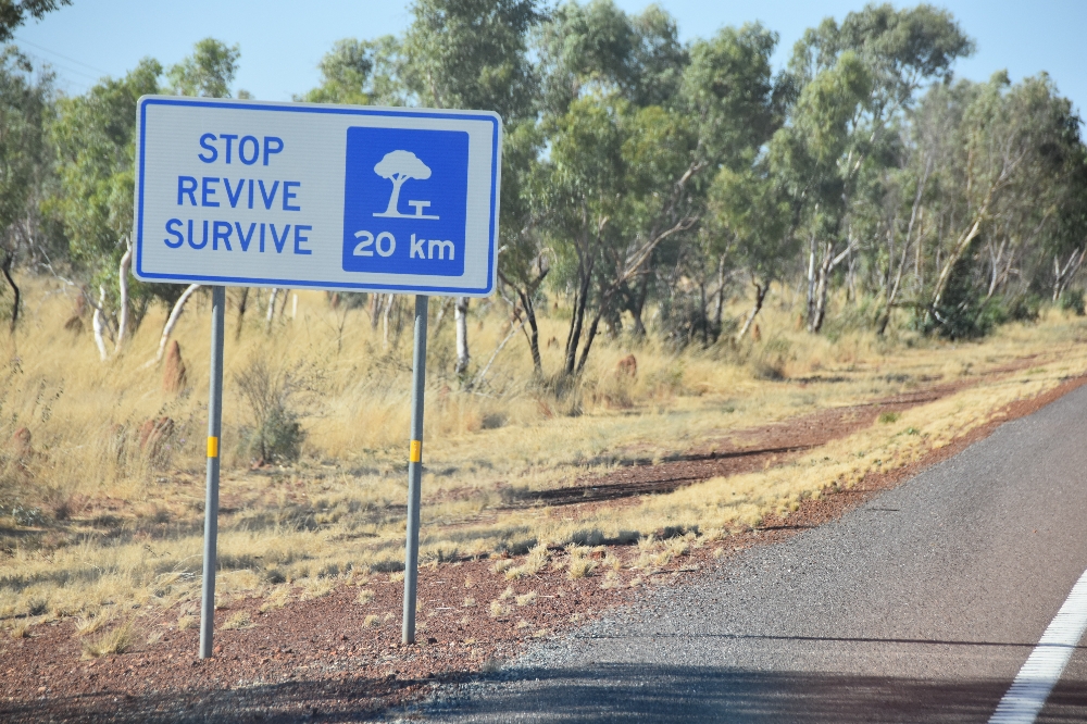 Wir haben schon an anderer Stelle von der Freundlichkeit der meisten Australier berichtet. Die Aussies können aber auch sehr deutlich werden, wenn sie es für angebracht halten. So z.B. bei den Gefahren des Autofahrens in der Wüste. Die Texte der Hinweisschilder sind zunächst nur nett...