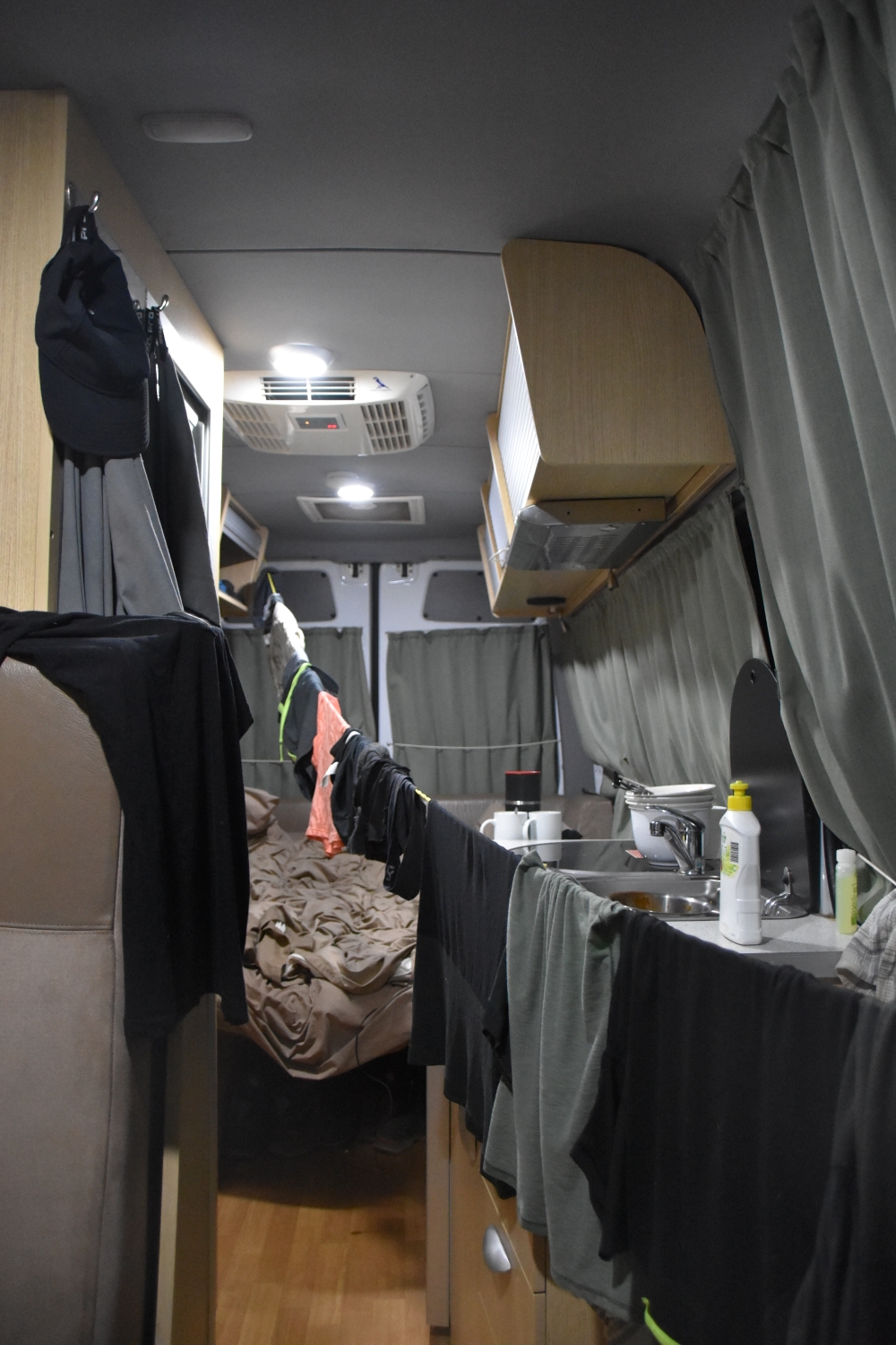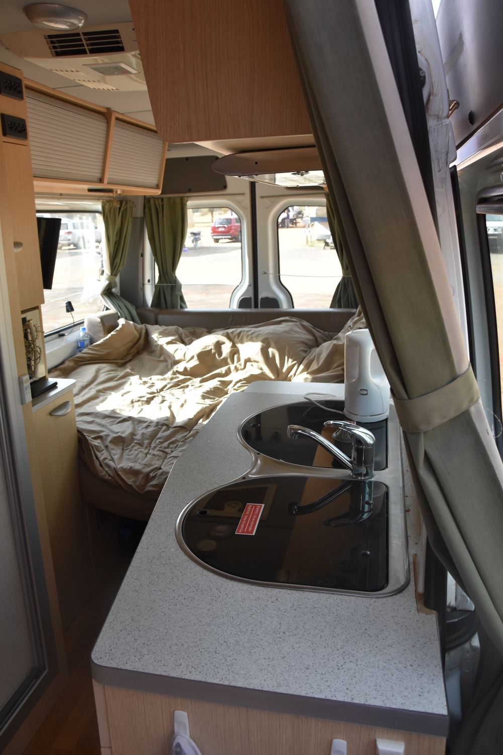 Und schließlich der Blick vom Cockpit zurück, vorbei an der Cooking-Area aus anderer Perspektive, zum Schlafbereich mit Blick in die unendliche Weite....