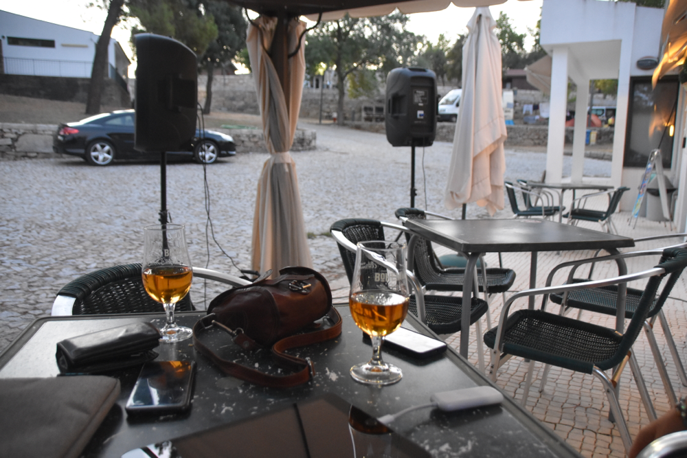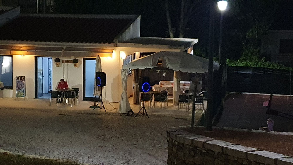 Zum Abschluss des Abends gibt es dann noch die Portugal-Camping-Party. Wir sind die einzigen Gäste. Dass sich das hier dennoch zu lohnen scheint, beweist der im Hintergrund geparkte fahrbare Untersatz von Jefe. Und so sieht das aus mit Jefe im Mittelpunkt: