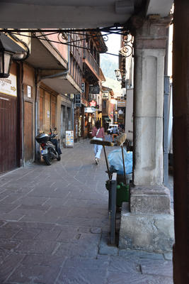 Also erst mal losradeln. Berg runter geht das gut. Auf dem Rückweg nach oben treffen wir schiebend einen Jakobsweg-Pilger und haben damit schon mal die erste Forderung der Weisheit erfüllt (man beachte bitte auch das Gepäckstück auf dem schwarzen Rad).
