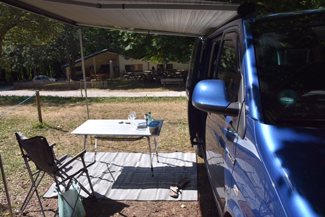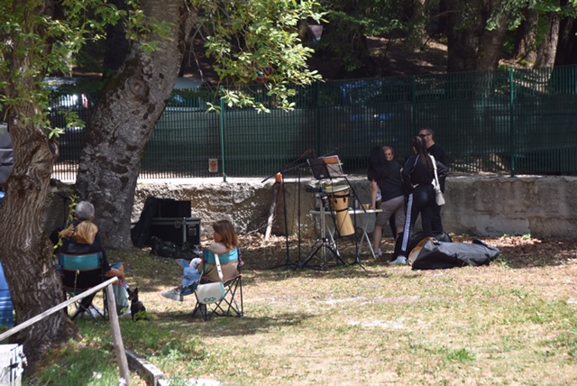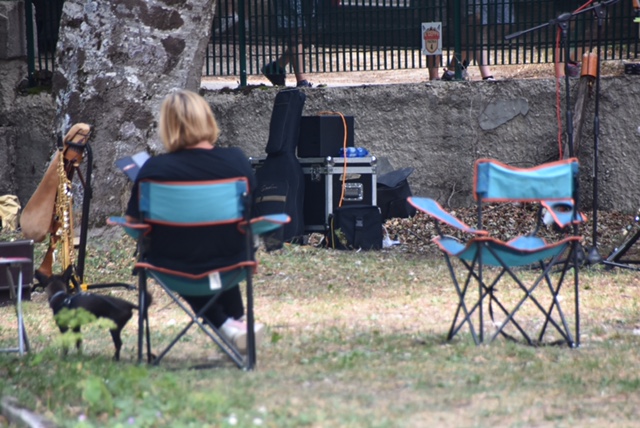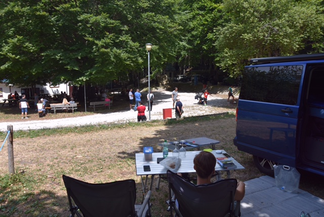 Roppopo ist nicht etwa das italienische Wort für Riesendoppelhintern, sondern der Name einer Musiktruppe, deren Auftritt für Sonntag um 11 Uhr auf unserem beschaulichen Waldcampingplatz angekündigt war. Etwa um 11 Uhr trafen erste Mitglieder der Band tatsächlich ein und begannen mit dem Aufbau, während wir es uns auf unseren Logenplätzen gemütlich machten:
