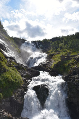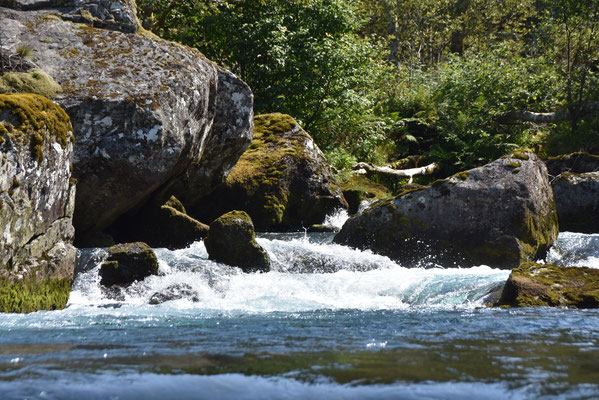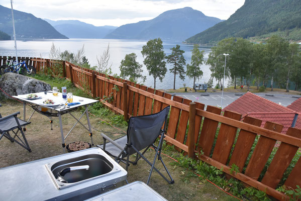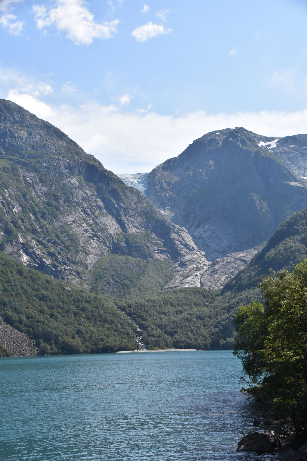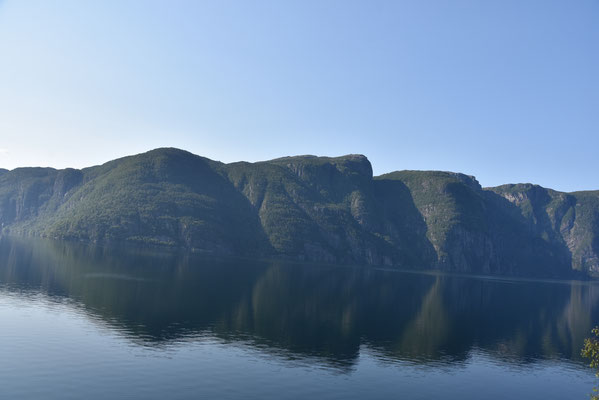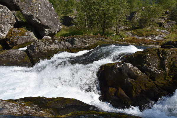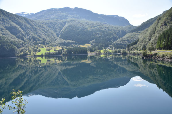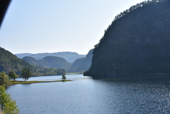 Hier gibt es reichlich Gegend. Herrliche Gegend. Gegend mit runden und eckigen Felsen, Gegend mit Schluchten mit und ohne Bach, Wanderwege durch Gegenden mit und ohne Geröll, Gegend mit Wiesen mit Schafen, Kühen oder Kirschbäumen. Gegend mit unzähligen kleinen und großen Wasserfällen und vor allem: Fjorde, Fjorde, Fjorde. Nur einer war nicht mehr da: der Bondhusgletscher ist kaum noch zu sehen - Klimawandel hautnah.