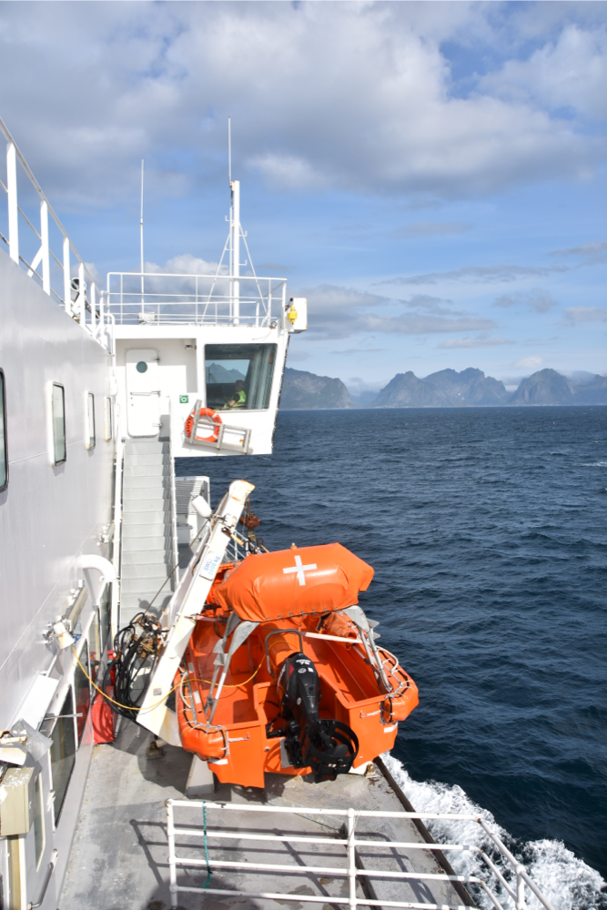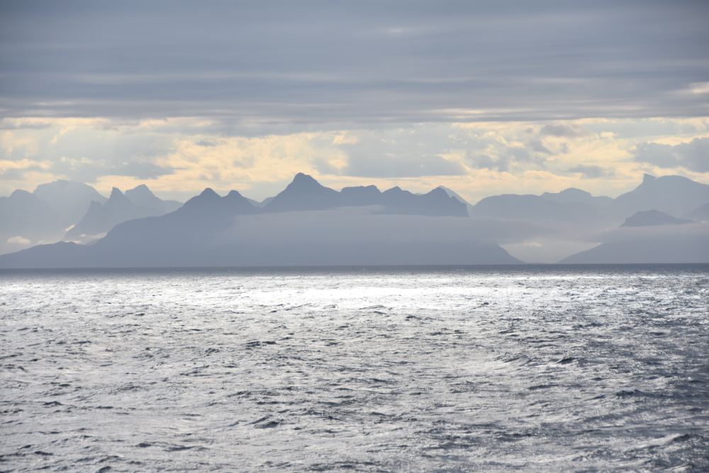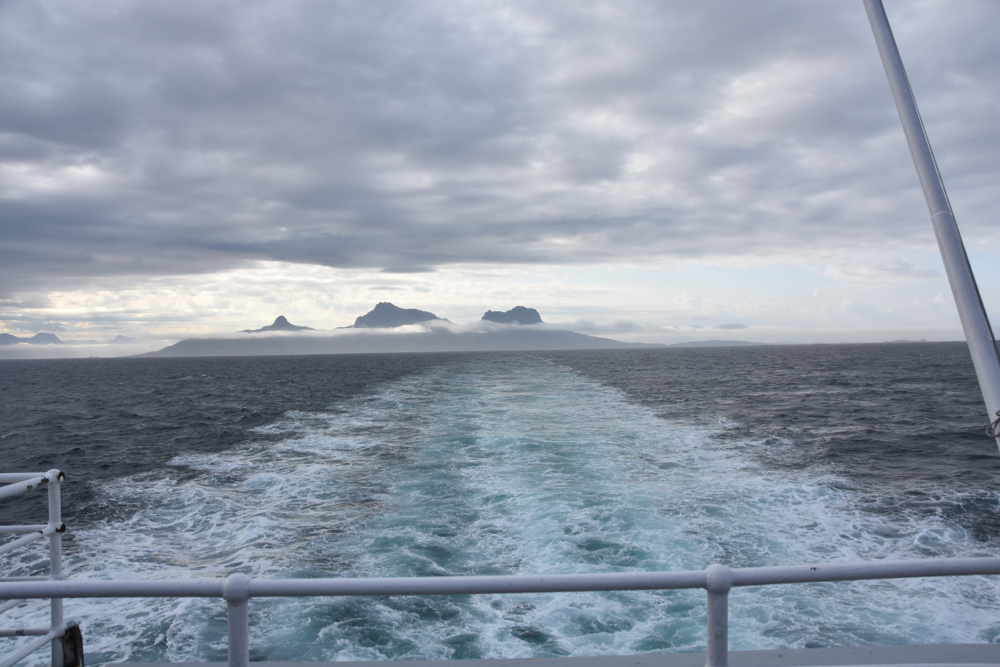 Auf den knapp 100 Kilometern Fahrt über das nordische Meer verändert sich das Wetter deutlich: Die Temperaturen sinken…der Wind nimmt zu.