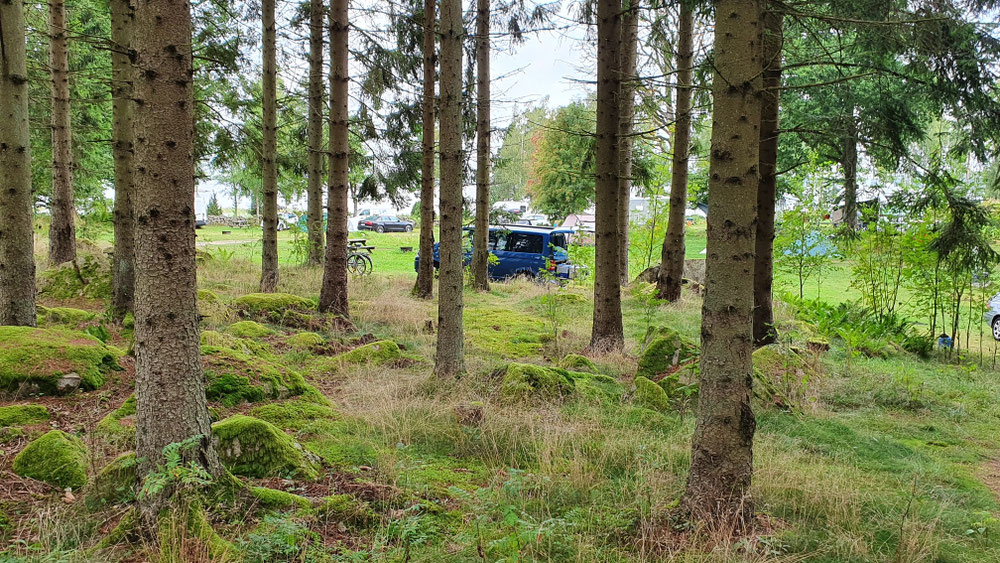 Wir sind im Südwesten Schwedens und wollen heute in den kleinen Ort Gustavsfors wandern. Alles liegt hier im Wald an einem See und über den müssen wir zuerst mal: