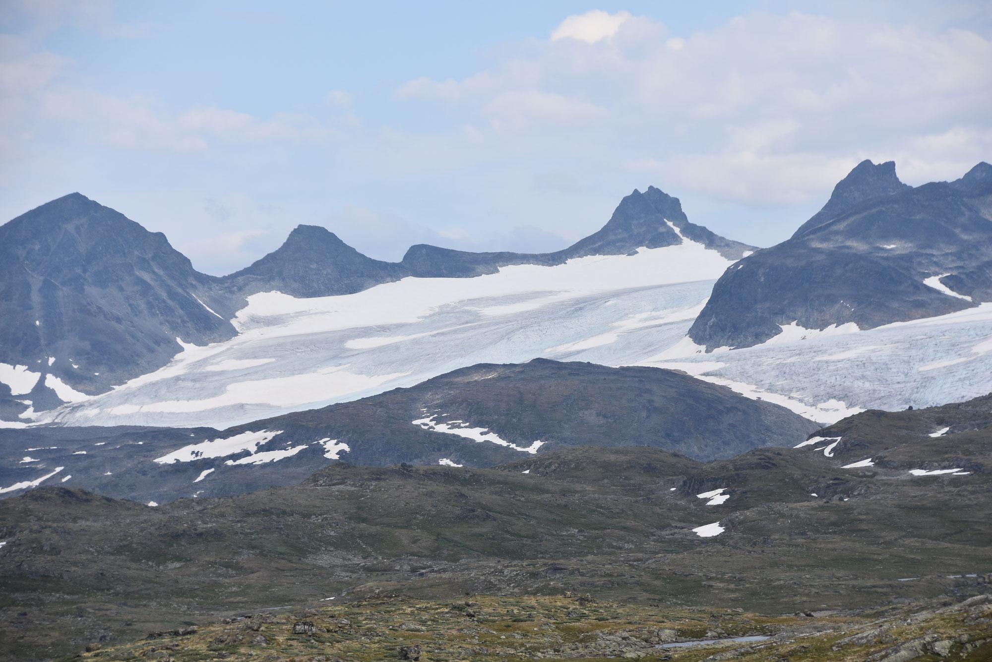 Hier gibt es reichlich Gegend. Herrliche Gegend. Gegend mit runden und eckigen Felsen, Gegend mit Schluchten mit und ohne Bach, Wanderwege durch Gegenden mit und ohne Geröll, Gegend mit Wiesen mit Schafen, Kühen oder Kirschbäumen. Gegend mit unzähligen kleinen und großen Wasserfällen und vor allem: Fjorde, Fjorde, Fjorde. Nur einer war nicht mehr da: der Bondhusgletscher ist kaum noch zu sehen - Klimawandel hautnah.