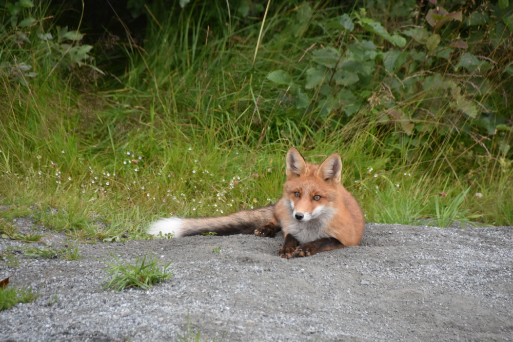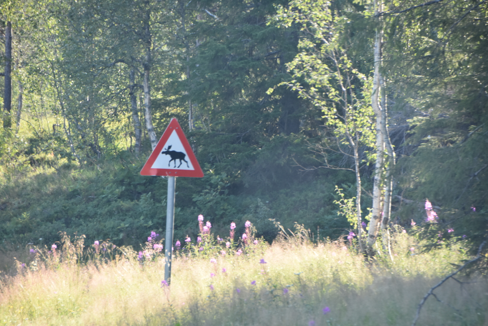 Elche suchen ist einfach. Wirklich schwer ist nur, welche zu finden. Dabei gibt es alle paar Kilometer sogar mehr oder weniger eindringliche Warnungen. Aber hier ist wohl ein Hinweis versteckt: Elche mögen wohl diese rosa Blümchen…