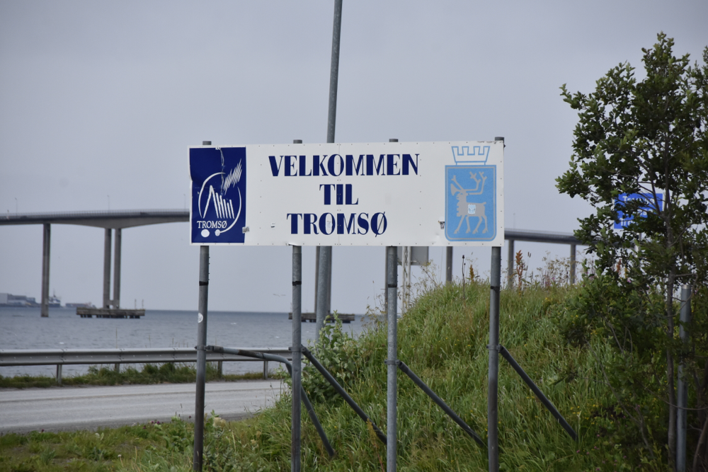 Immerhin heißt man uns noch willkommen: Tromsø. Nord-Norwegen. Sch…Wetter. 9 Grad. Regen. Nach exakt 5000 gefahrenen Kilometern der nördlichste Punkt der Reise.