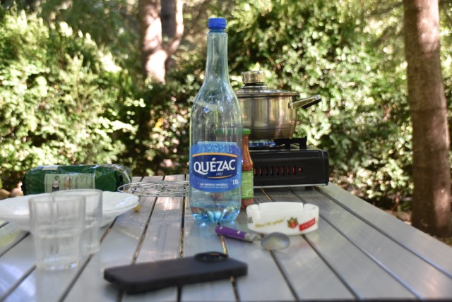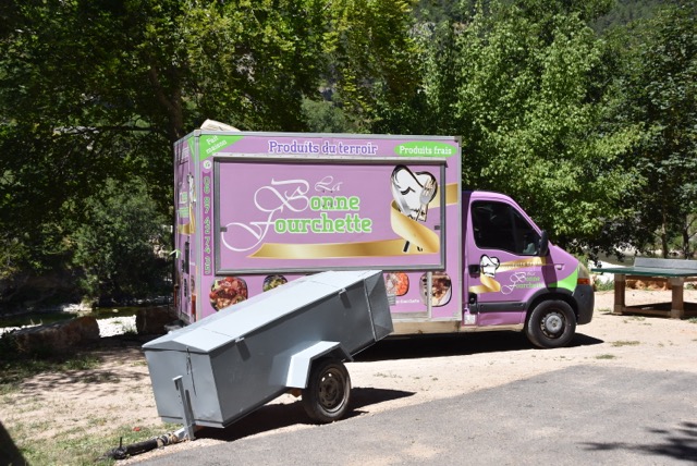 Allerdings steht an der gewiesenen Stelle zwar die angekündigte „Gute Gabel“, aber der Imbisswagen brutzelt nur selbst in der südfranzösischen Sonne, anstatt uns leckere Speisen zu brutzeln. Er hatte zum Ärger seiner Besitzerin eine Panne und kann erst morgen Essen zubereiten…das tröstet schon etwas, denn wir merken: Mit unseren Auto-Problemen sind wir nicht alleine: