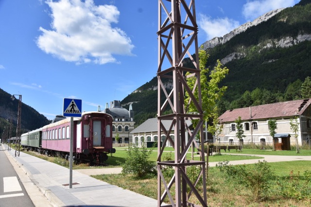 Und gegenüber der Prachtherberge hat man einen provisorischen Bahnhof errichtet, von dem man zwar nicht in die große weite Welt, aber immerhin in die nahe spanische Provinz reisen kann. Der Weg nach Frankreich ist versperrt. Zufällig kommt heute ein edler Nostalgie-Sonderzug vorbei und erlaubt Träume von der großen weiten Welt.