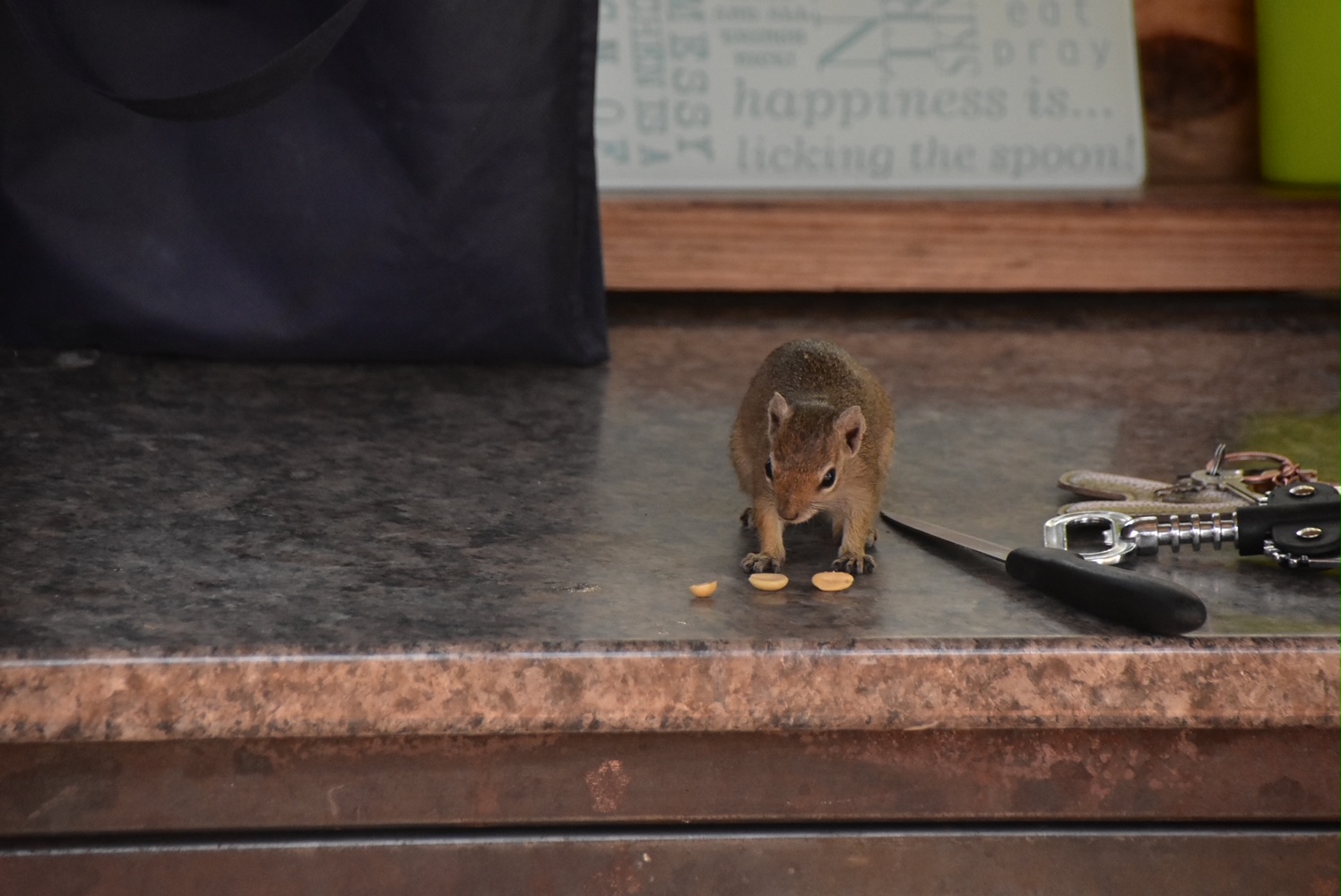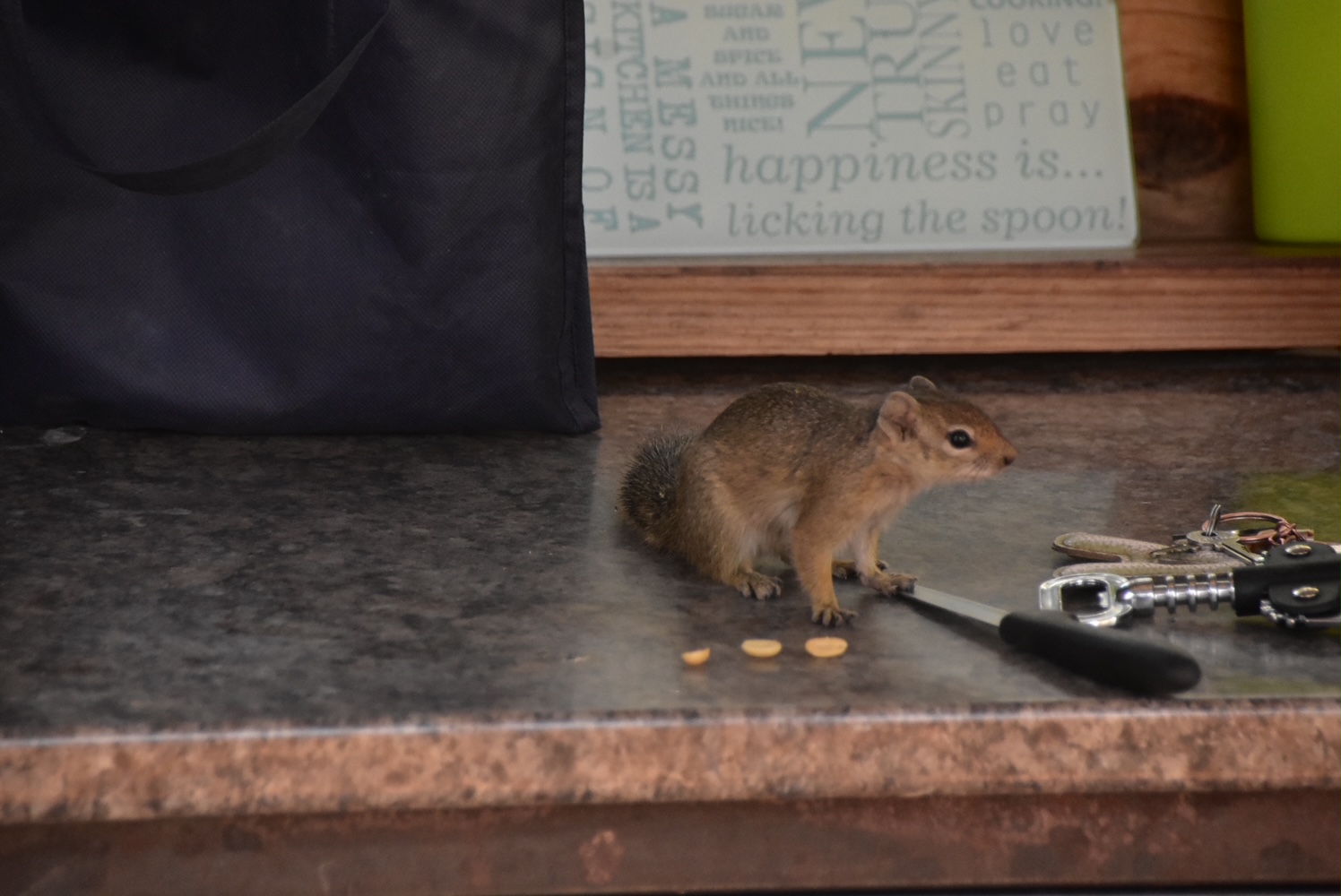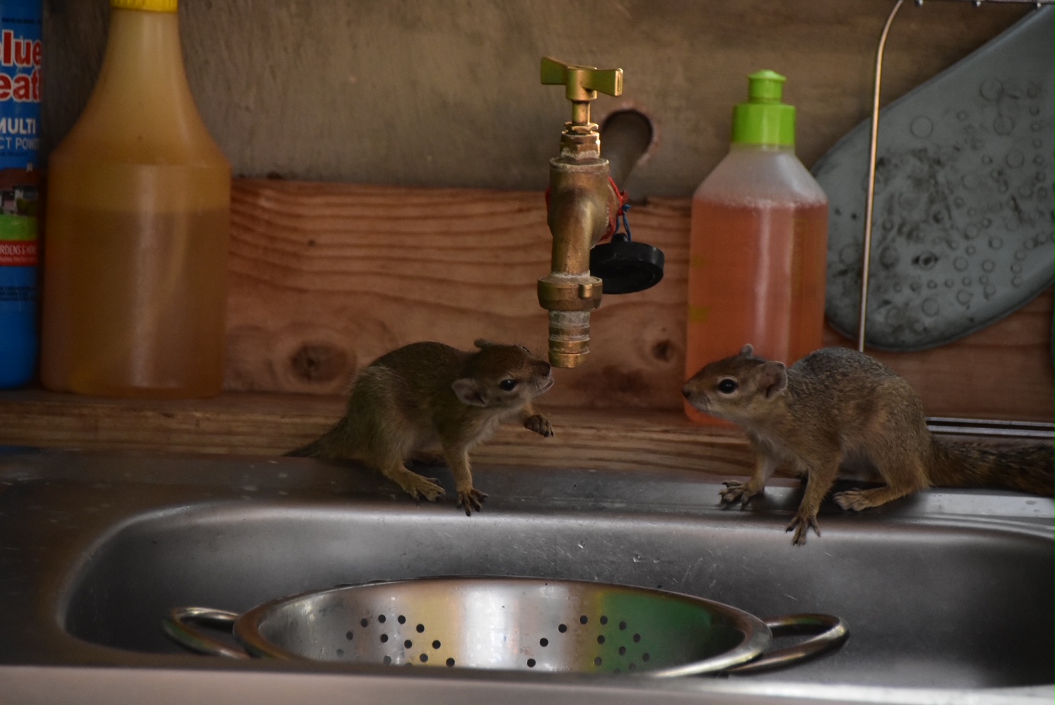 Außenküchen haben ihren ganz besonderen Charme. Hier sind zwei sehr clevere Hörnchen am Werk. Das erste Hörnchen macht sich am Wasserhahn zu schaffen: