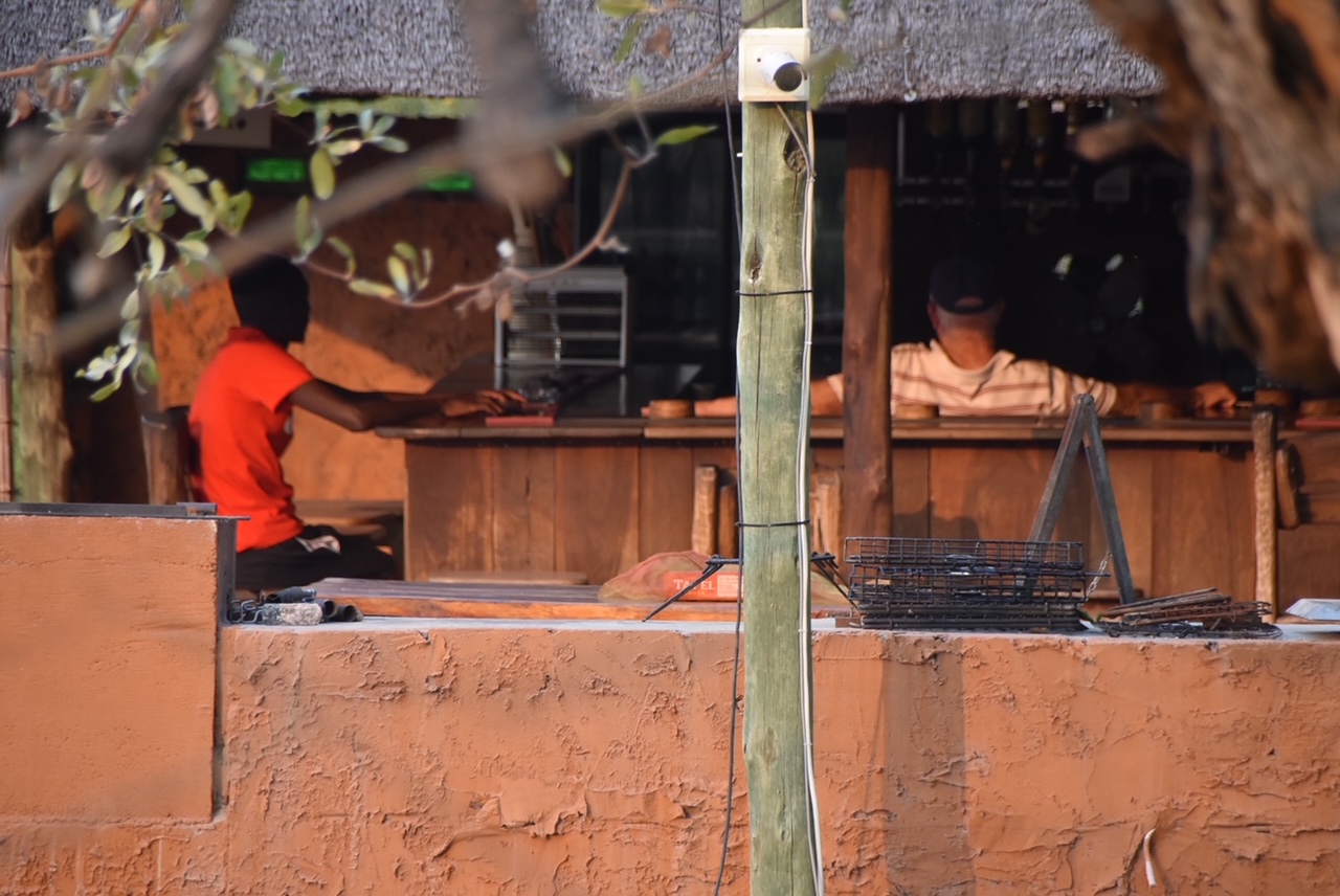 Unser Camp mit den lustigen Haustieren am Okavango haben wir fast für uns alleine. Der Besitzer betreibt das Ganze recht entspannt mit zwei Angestellten und ist selbst der häufigste Gast seiner Bar: