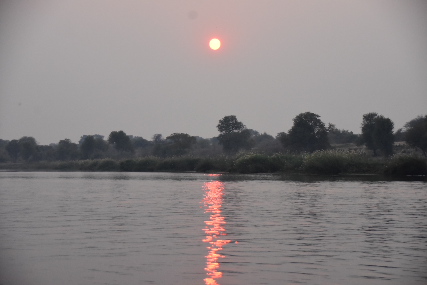 Der Campbesitzer bietet eine Sonnenuntergangs-Bootstour auf dem Okavango an. In der Hoffnung, Flusspferde zu sehen, nehmen wir an und nehmen mit Getränk auf dem Boot Platz: